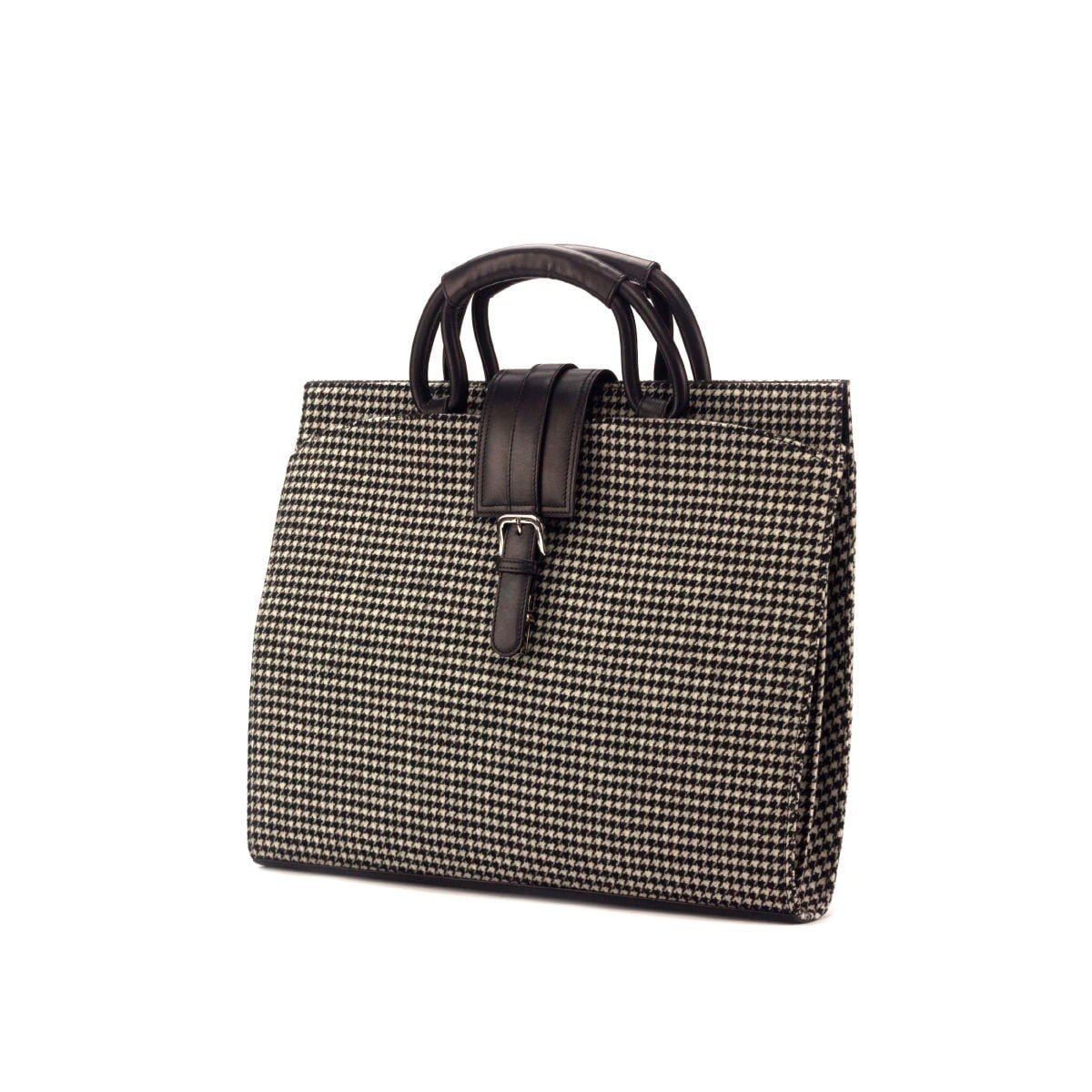 Elevate your professional wardrobe with our Houndstooth Sartorial Black Leather Briefcase, the ultimate accessory for today’s modern professional. Crafted from premium houndstooth sartorial fabric and black painted calf leather, this sleek briefcase strikes the perfect balance between style and functionality. With dimensions of 13 x 16.5 x 2 inches (33 x 42 x 5 cm), it offers ample space for carrying important documents, electronic devices, and daily essentials, making it ideal for business meetings or daily commutes. The fully lined black fabric interior ensures that your items stay secure and well-organized.