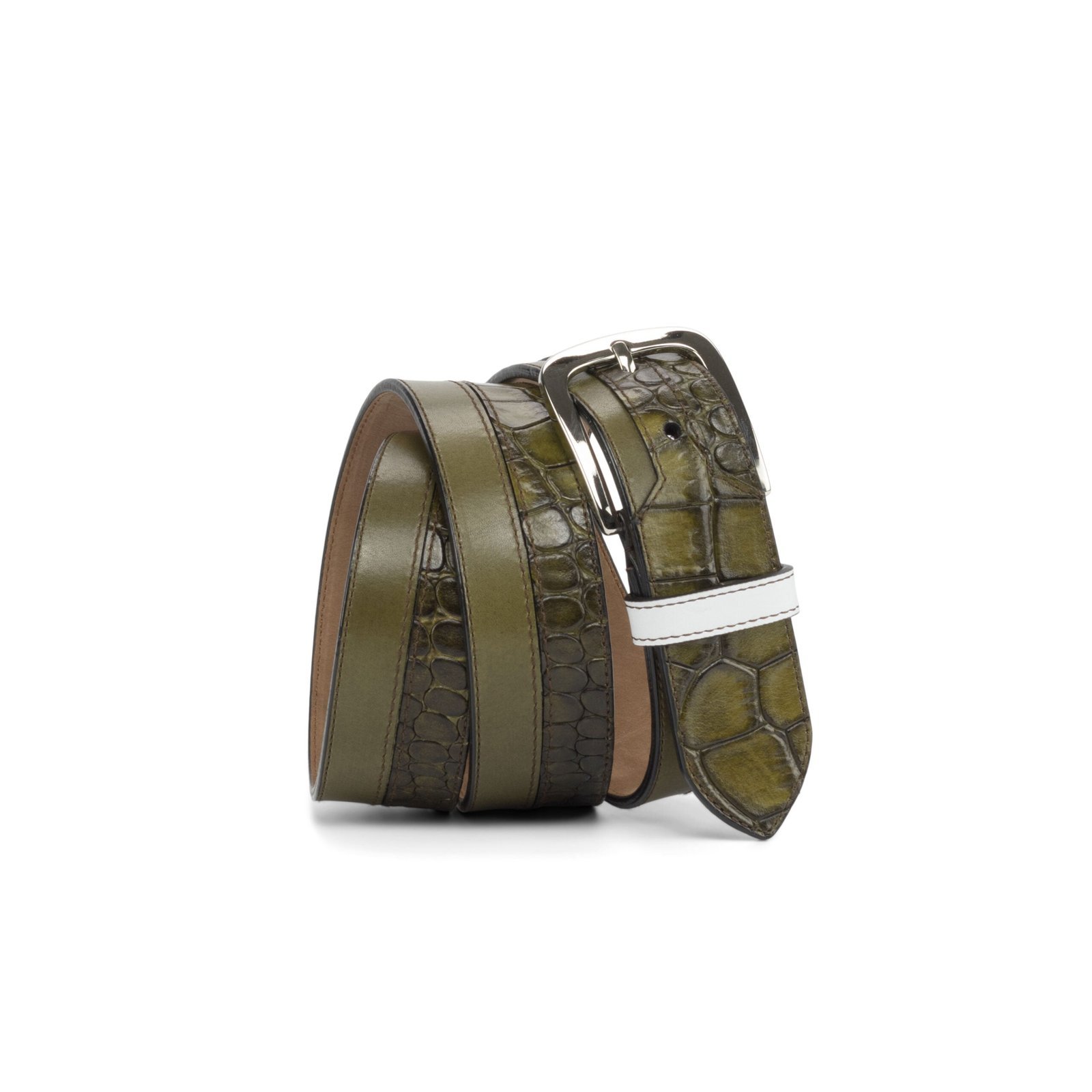 Introducing our White and Olive Marseille Belt, a striking accessory designed to make a statement. Crafted from a combination of white box calf leather, olive painted calf leather, and olive painted crocodile embossed leather, this belt offers a unique blend of textures and colors. The luggare nubuck lining adds a luxurious feel against the waist.